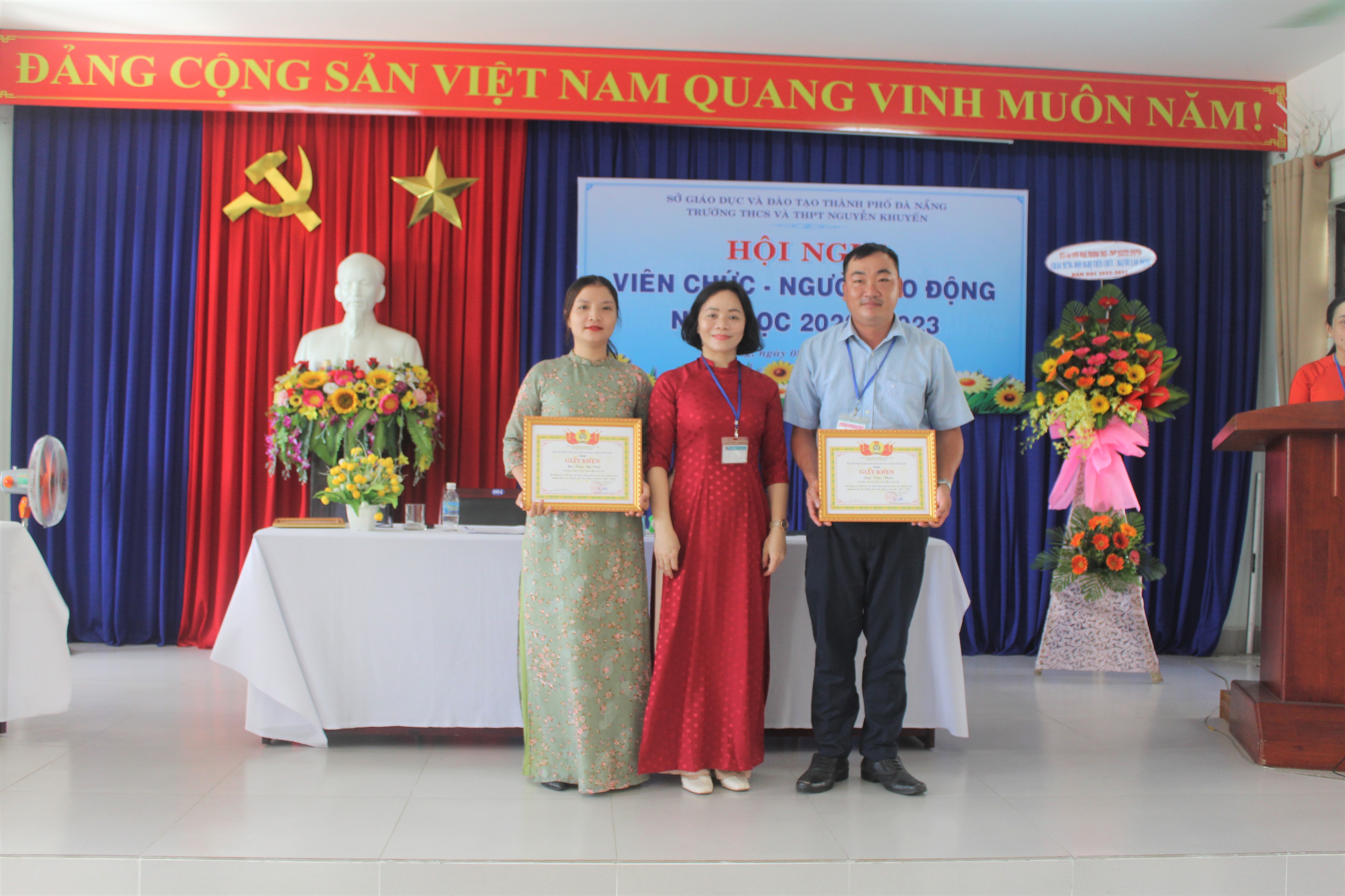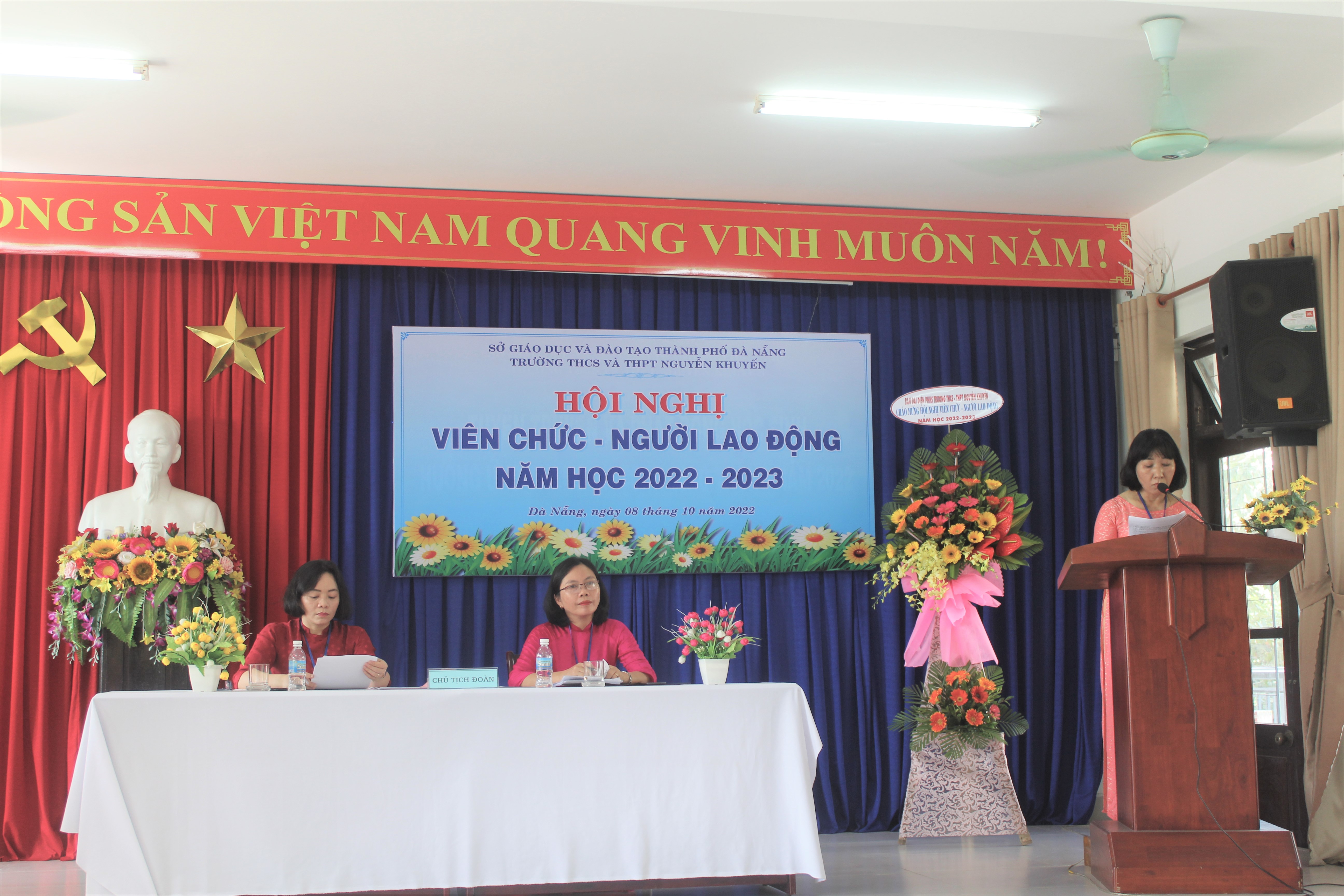 Hôm nay, ngày 08 tháng 10 năm 2022, Trường THCS & THPT Nguyễn Khuyến tổ chức Hội nghị Viên chức-Người lao động năm học 2022-2023. Về dự với Hội nghị có Ông Võ Thái Dương, Chuyên viên Phòng GDTrH, Sở GD và Đào tạo Đà Nẵng cùng toàn thể giáo viên, nhân viên nhà trường cũng có mặt đông đủ. Sau một buổi sáng làm việc khẩn trương, nghiêm túc; Hội nghị đã đánh giá công tác dạy – học năm học 2021-2022, đồng thời đề ra các nhiệm vụ, giải pháp và chỉ tiêu năm học 2022-2023.