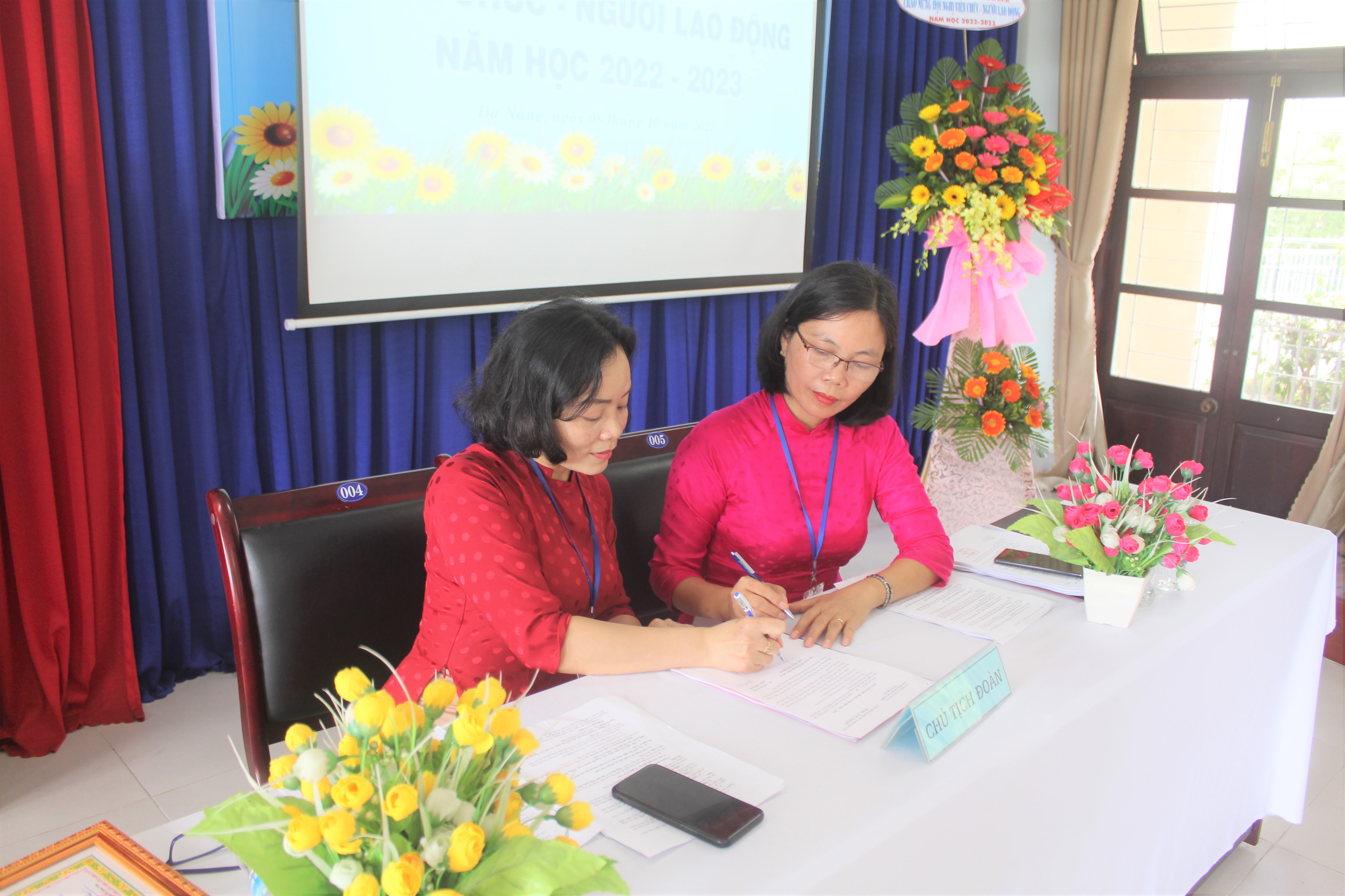 Cô Trần Thị Kim Vân – Hiệu trưởng và Cô Lê Thị Thu Hà – Chủ tịch công đoàn nhà trường kí giao ước thi đua