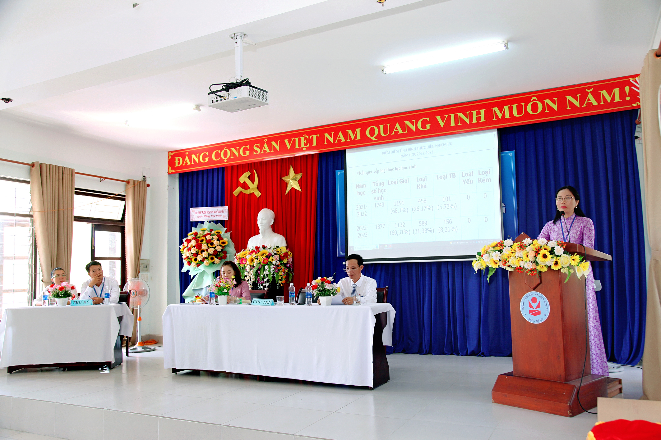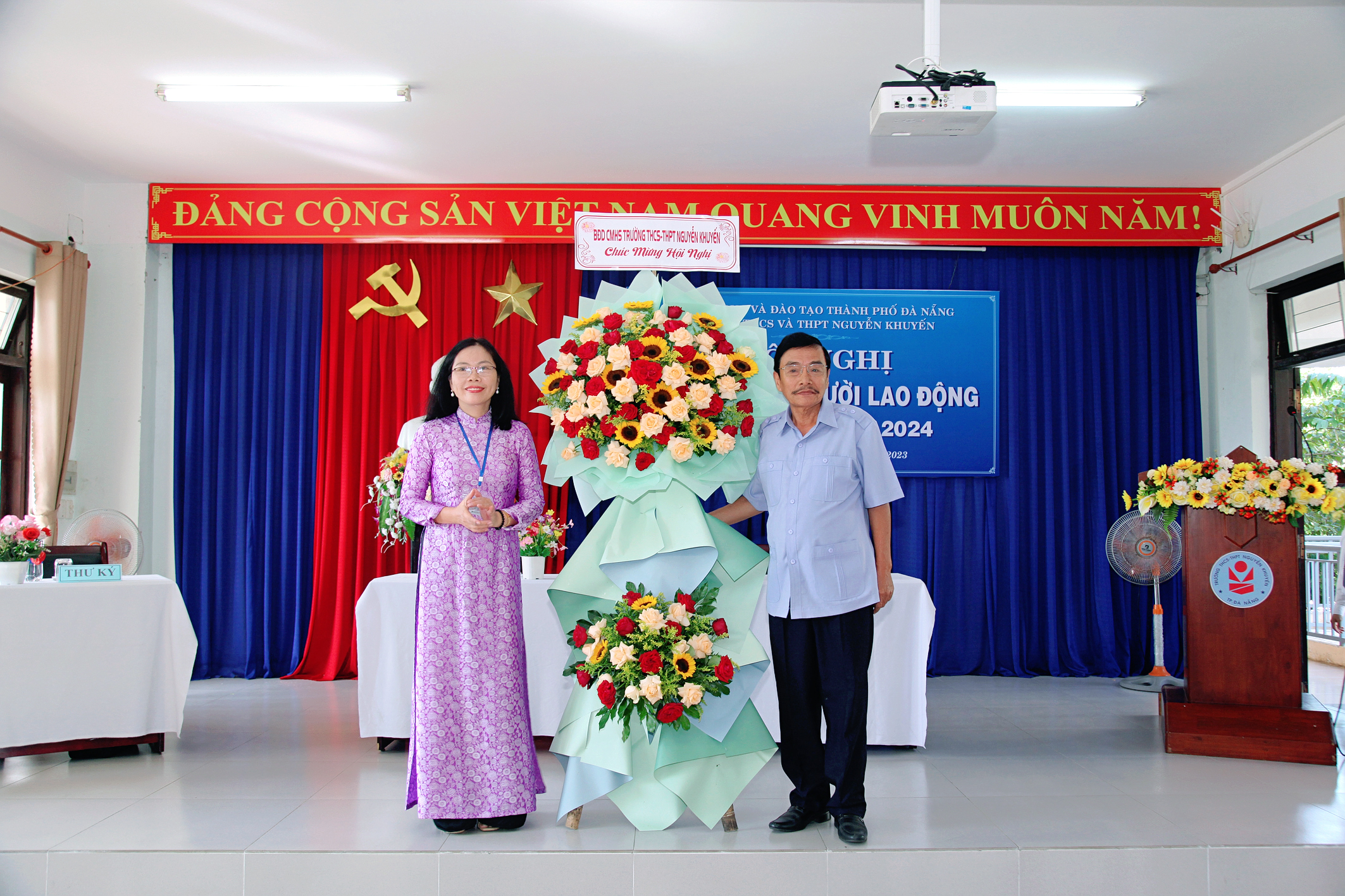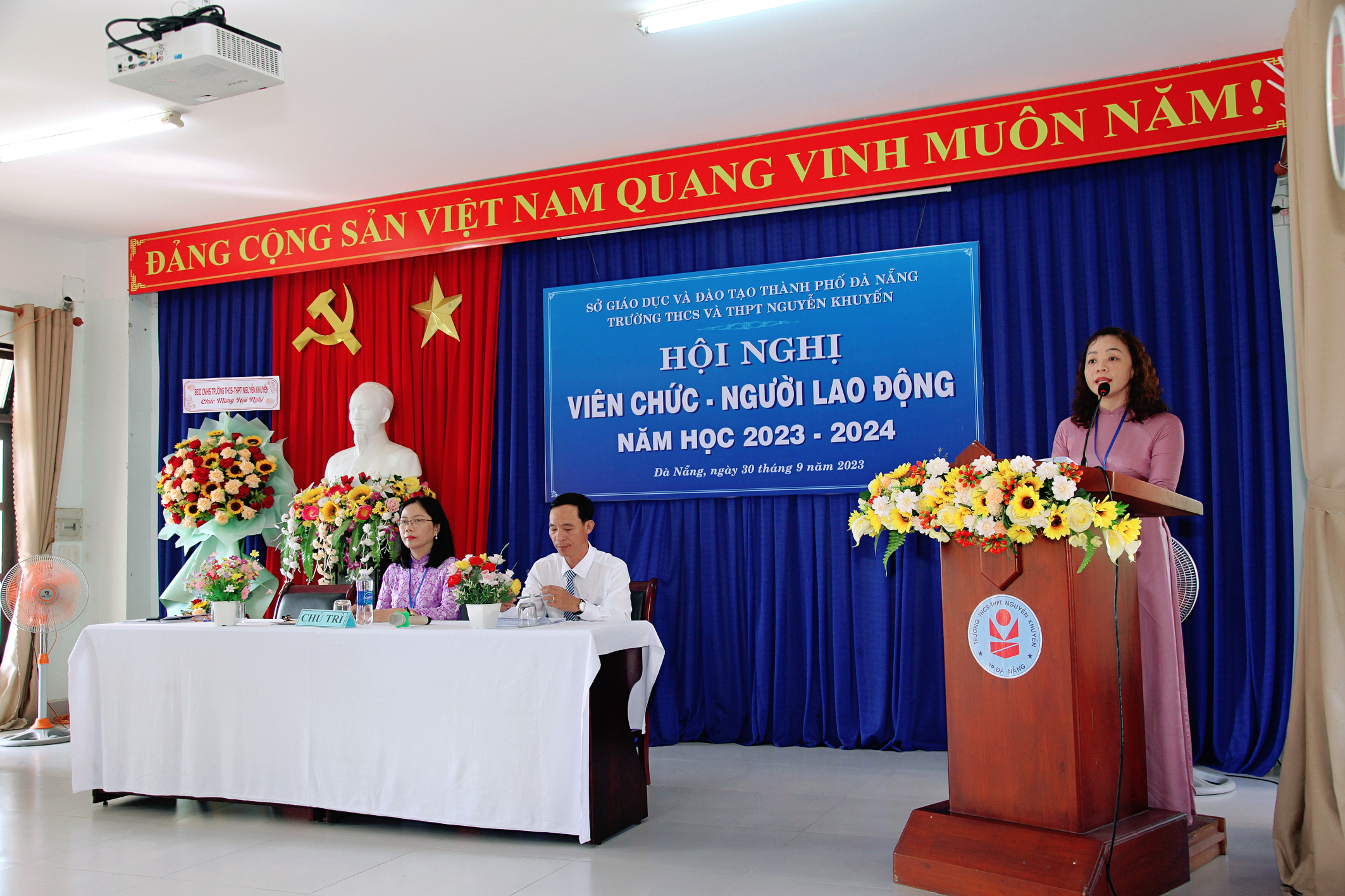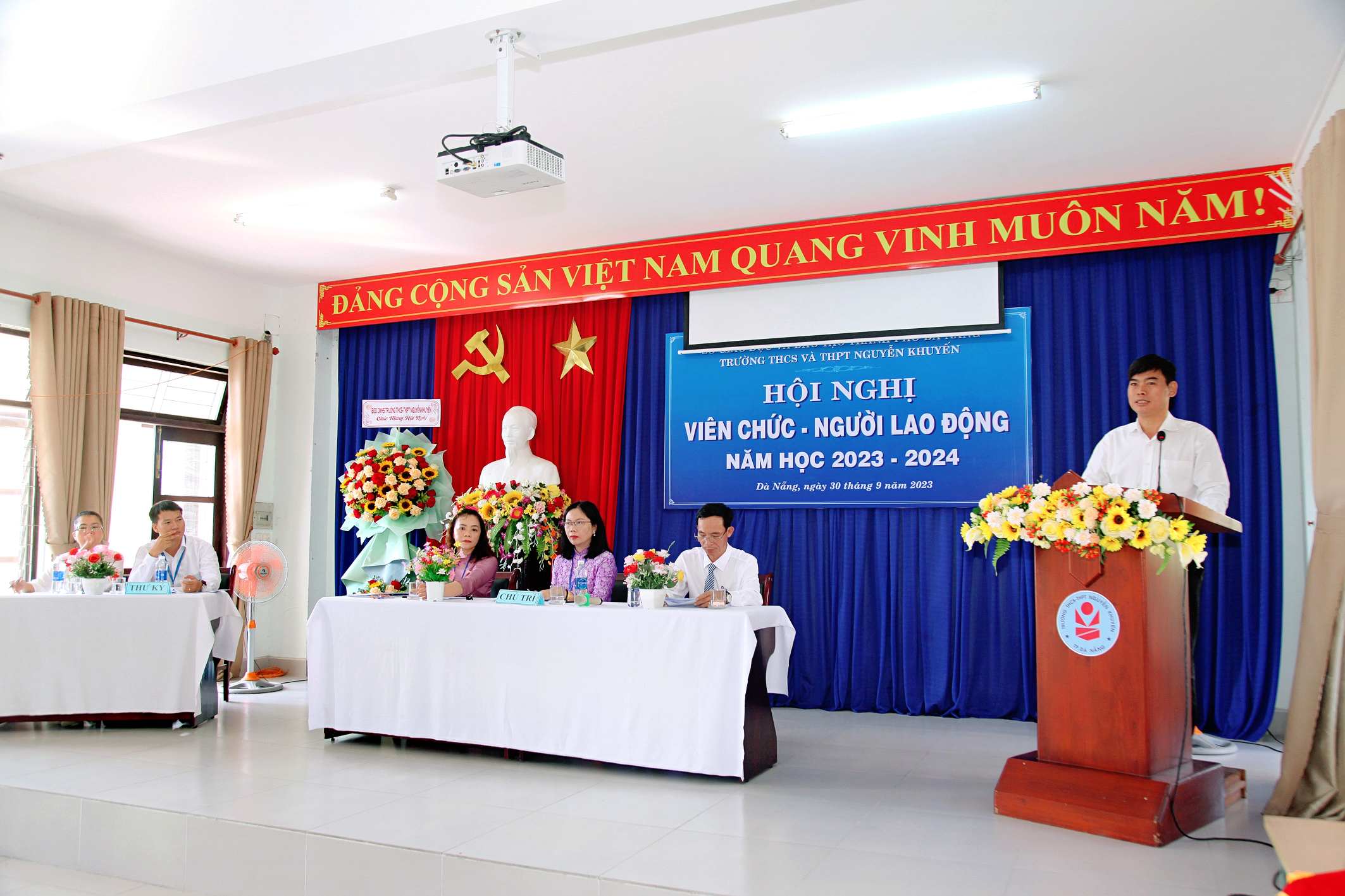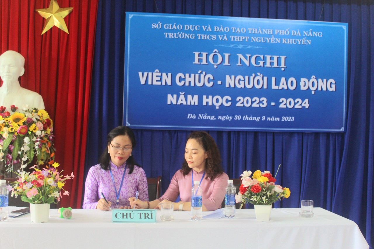 Hôm nay, ngày 30 tháng 9 năm 2023, Trường THCS & THPT Nguyễn Khuyến tổ chức Hội nghị Viên chức-Người lao động năm học 2023-2024. Về dự với Hội nghị có Ông Ngô Ngọc Hoàng Vương, Trưởng phòng Giáo dục chính trị và Công tác học sinh sinh viên – Sở GD và ĐT Đà Nẵng; Ông Nguyễn Văn Trương, Trưởng ban đại diện CMHS nhà trường cùng toàn thể giáo viên, nhân viên nhà trường cũng có mặt đông đủ. Sau một buổi sáng làm việc khẩn trương, nghiêm túc; Hội nghị đã đánh giá công tác dạy – học năm học 2022-2023, đồng thời đề ra các nhiệm vụ, giải pháp và chỉ tiêu năm học 2023-2024.