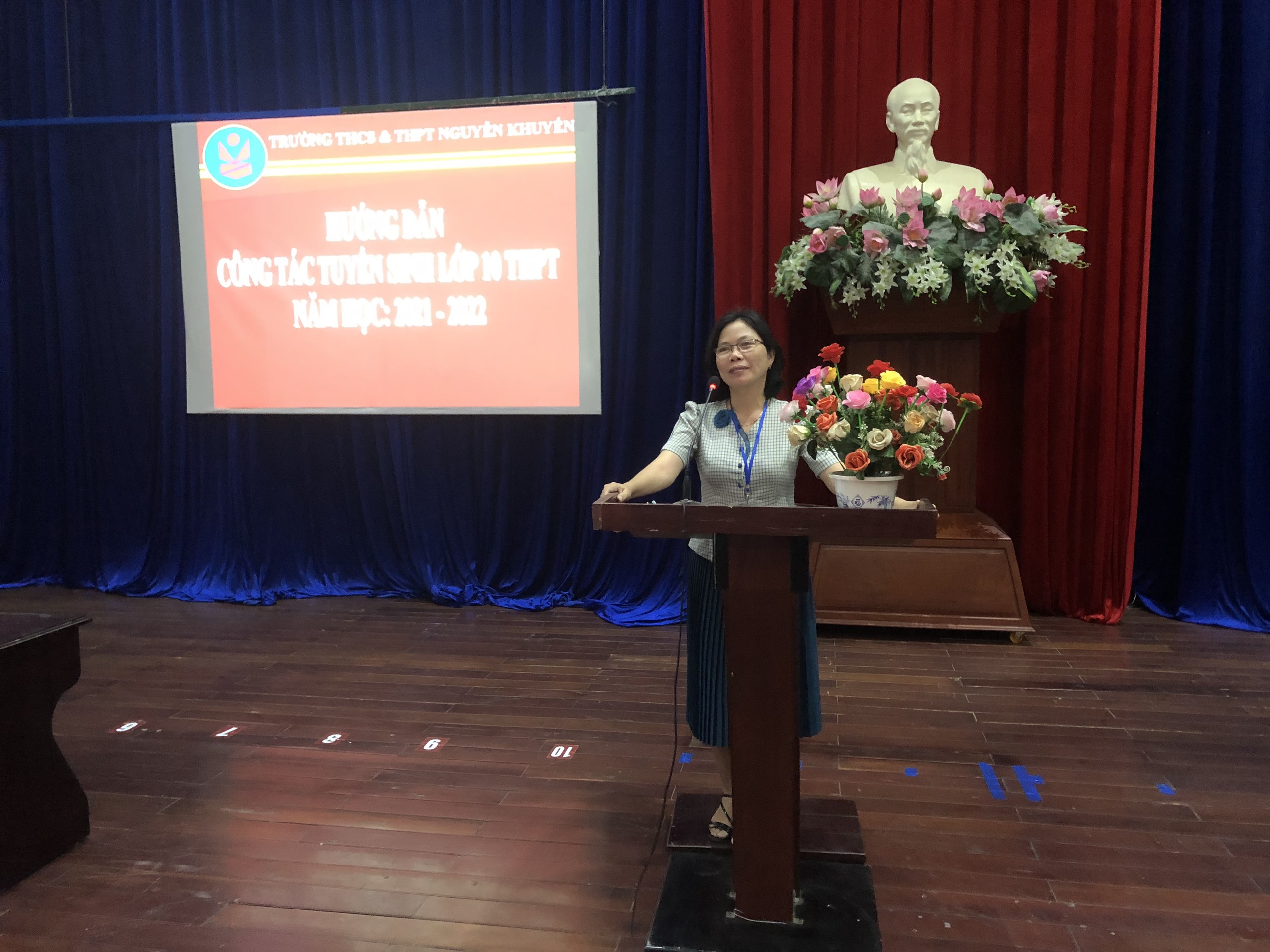 Cô Trần Thị Kim Vân – Hiệu trưởng nhà trường đã trực tiếp phổ biến kỹ kế hoạch tuyển sinh lớp 10 THPT năm học 2022-2023, đặc biệt là tập trung những điểm liên quan đến thí sinh, cách điền phiếu ĐKDT, ĐKTT, đăng kí thay đổi nguyện vọng và thời hạn nộp hồ sơ, lưu ý các quy định liên quan đến điểm xét tuyển, chế độ ưu tiên, hạnh kiểm và học lực 04 năm ở cấp THCS để lập hồ sơ đăng kí.