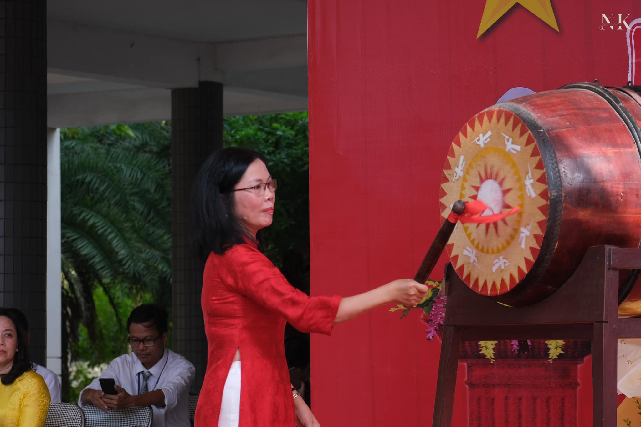 Cô Trần Thị Kim Vân – Bí thư chi bộ, Hiệu trưởng nhà trường phát biểu chào mừng và đánh trống khai trường