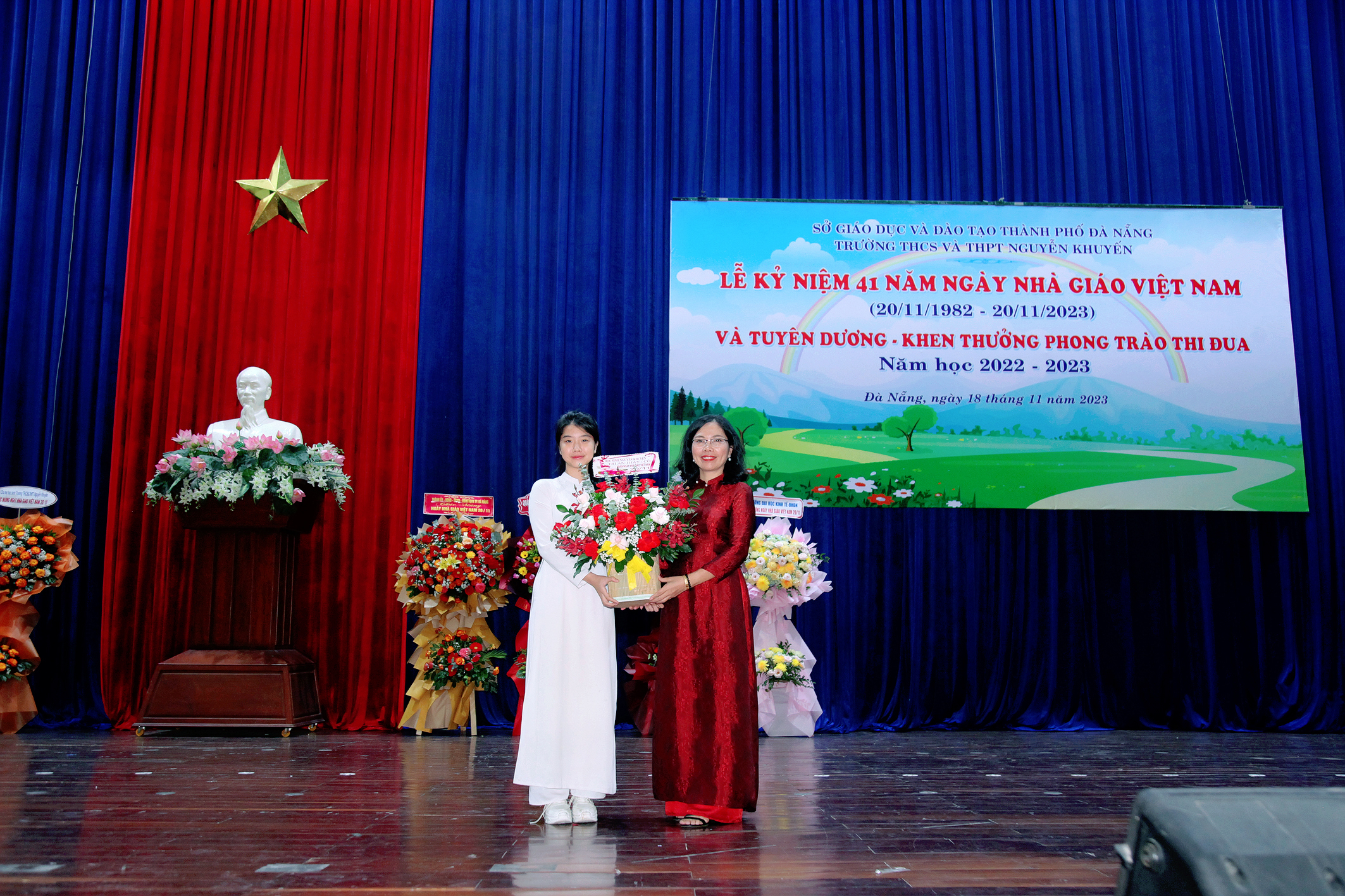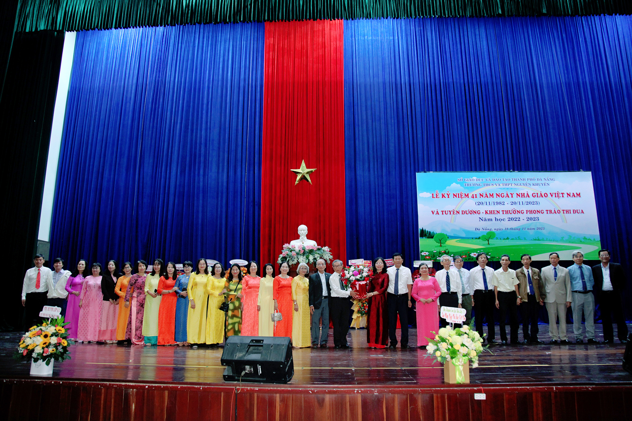 Trong không khí rộn ràng những ngày cuối tháng mười một, Trường THCS và THPT Nguyễn Khuyến long trọng tổ chức Lễ kỉ niệm 41 năm ngày Nhà giáo Việt Nam (20/11/1982 – 20/11/2023) và tuyên dương, khen thưởng phong trào thi đua năm học 2022 – 2023; đây là dịp để các thế hệ thầy và trò cùng nhau ôn lại truyền thống của nghề dạy học đồng thời tuyên dương khen thưởng những tập thể, cá nhân đã đạt thành tích trong phong trào thi đua năm học 2022 – 2023.